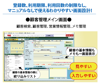 お客様の営業戦略に必要な、顧客管理、顧客検索、メモ検索、営業一覧、従業員管理、履歴管理、スケジュール管理、DM宛名印刷、メール一括送信、FAX送信状印刷、重複チェック機能、ネットワーク共有、インポート機能、CTI機能、連絡帳機能、オリジナル項目作成機能、メンテナンス機能、エクスポート機能など無駄を削減した効率的な経営に必要な基本の顧客管理システムになっています。