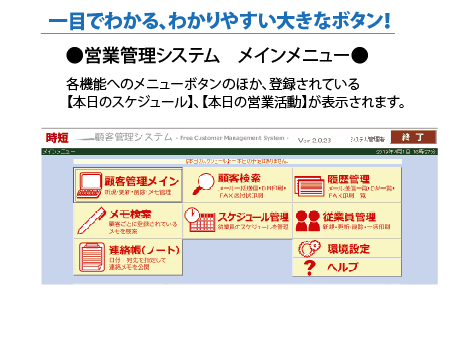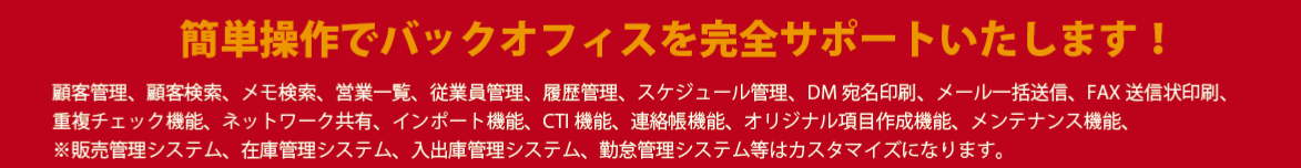 お客様の営業戦略に必要な、顧客管理、顧客検索、メモ検索、営業一覧、従業員管理、履歴管理、スケジュール管理、DM宛名印刷、メール一括送信、FAX送信状印刷、重複チェック機能、ネットワーク共有、インポート機能、CTI機能、連絡帳機能、オリジナル項目作成機能、メンテナンス機能、エクスポート機能など無駄を削減した効率的な経営に必要な基本の顧客管理システムになっています。